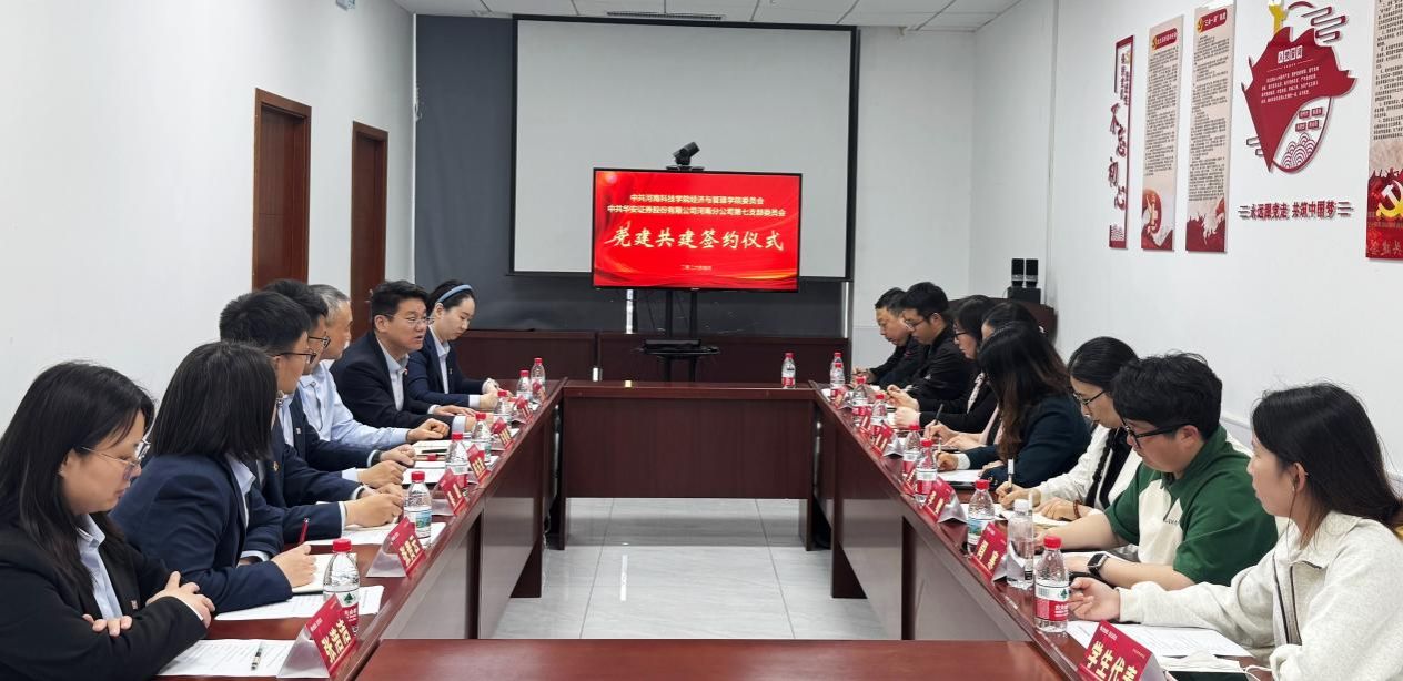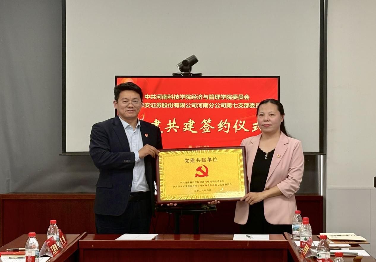 为深化校企党建共建,拓宽学生实习就业渠道,4月24日,经济与管理学院党委副书记、院长崔鸽,党委副书记吴丹等师生党员代表一行,赴华安证券河南分公司第七党支部开展校企党建共建活动。华安证券河南分公司党总支副书记许鲁南、第七党支部书记李帅等热情接待。