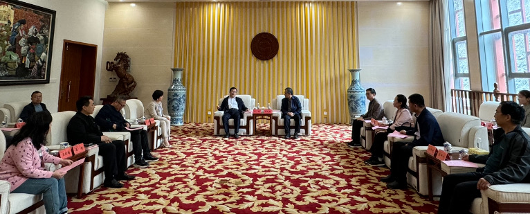 4月22日下午,贵州民族大学校长王林会见了王庆兵一行,双方在贵州民族大学新校区进行交流。王林对王庆兵一行表示热烈欢迎,详细介绍了贵州民族大学的发展历程和办学特色,尤其是建设具有鲜明特色的高水平一流民族大学情况。王庆兵对贵州民族大学的热情接待表示感谢。他介绍了我校的发展历程、基本情况以及学校近年来在农学、人工智能等领域取得的主要成绩。双方就博士点申报、学科建设、专业优化调整、人才培养新模式、毕业生就业促进等问题展开点对点深入交流。会后,参观了民族文化展馆、陶艺展馆和模式识别与智能系统重点实验室。