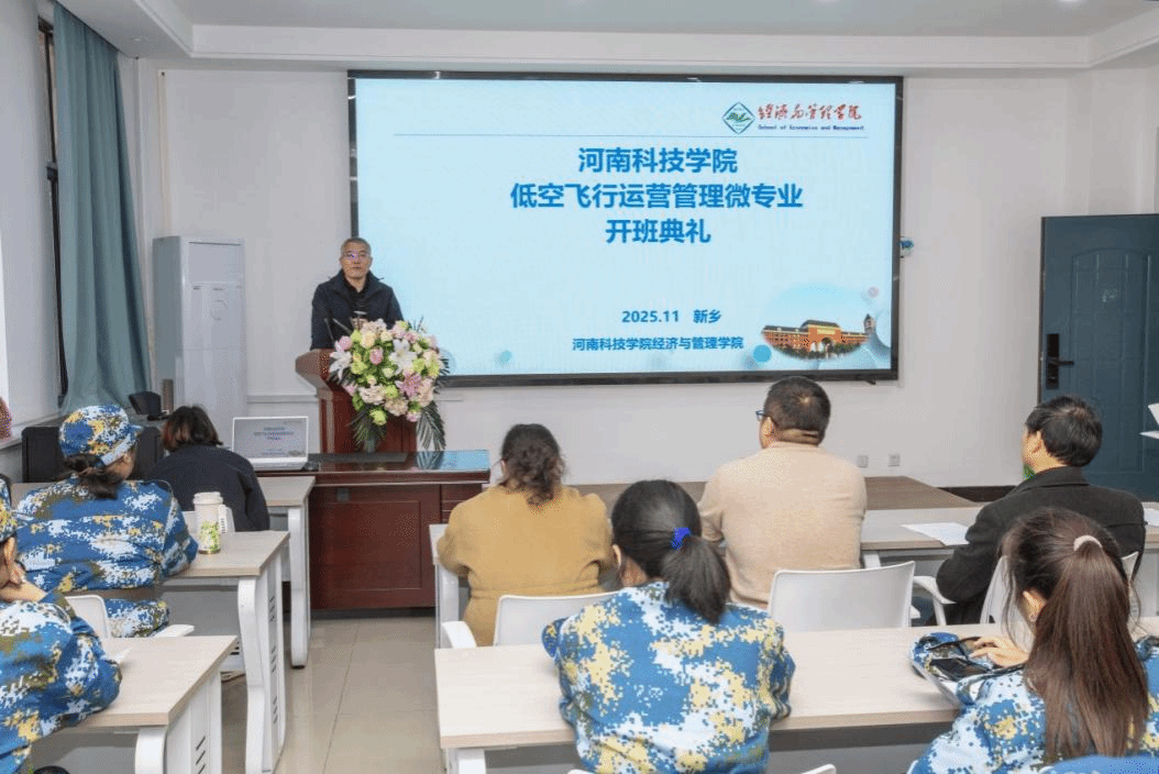11月1日上午,在10#206报告厅,经济与管理学院举行低空飞行运营管理微专业开班仪式。这是对接国家低空经济发展战略、深化产教融合、培养新兴领域交叉复合型人才的举措之一。学院党委书记何二毛、副院长翟士军、三维圈数科集团校企合作负责人周函露、市场营销教研室主任王杰芳和首届微专业同学、军训飞行项目表演新生等一同参加仪式。吴国庆老师主持。