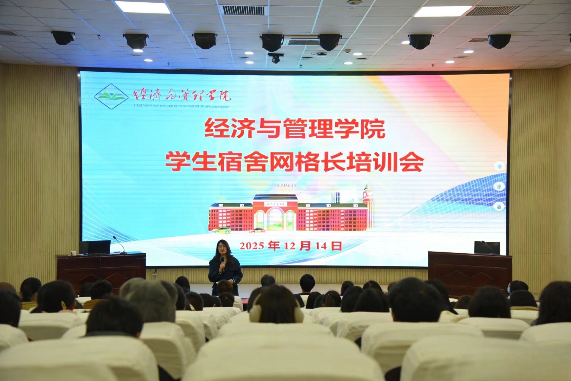 为深入落实学生管理精细化要求,提升宿舍网格化管理效能,12月14日下午,经济与管理学院在图书馆一楼报告厅举办宿舍网格长培训会议。校学生处副处长冯岩受邀为300余名宿舍网格长、网格员作专题培训。学院党委副书记吴丹主持会议。