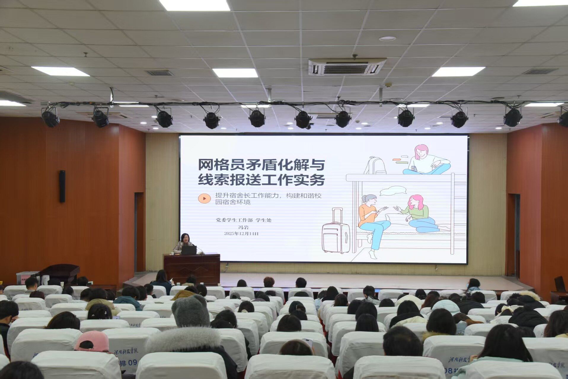 校学生处副处长冯岩以“宿舍网格员矛盾排解与线索报送工作实务”为题作专题辅导。从网格员角色定位、核心职责、矛盾调解“四步法”、信息报送等方面进行系统讲解,阐述了网格工作对学生综合能力培养的重要意义。冯岩强调,网格员要聚焦宿舍日常事务,重点提升三方面能力:有效沟通化解矛盾、规范报送各类信息、初步处置突发状况。培训内容结合实例,兼具理论性与实操性。