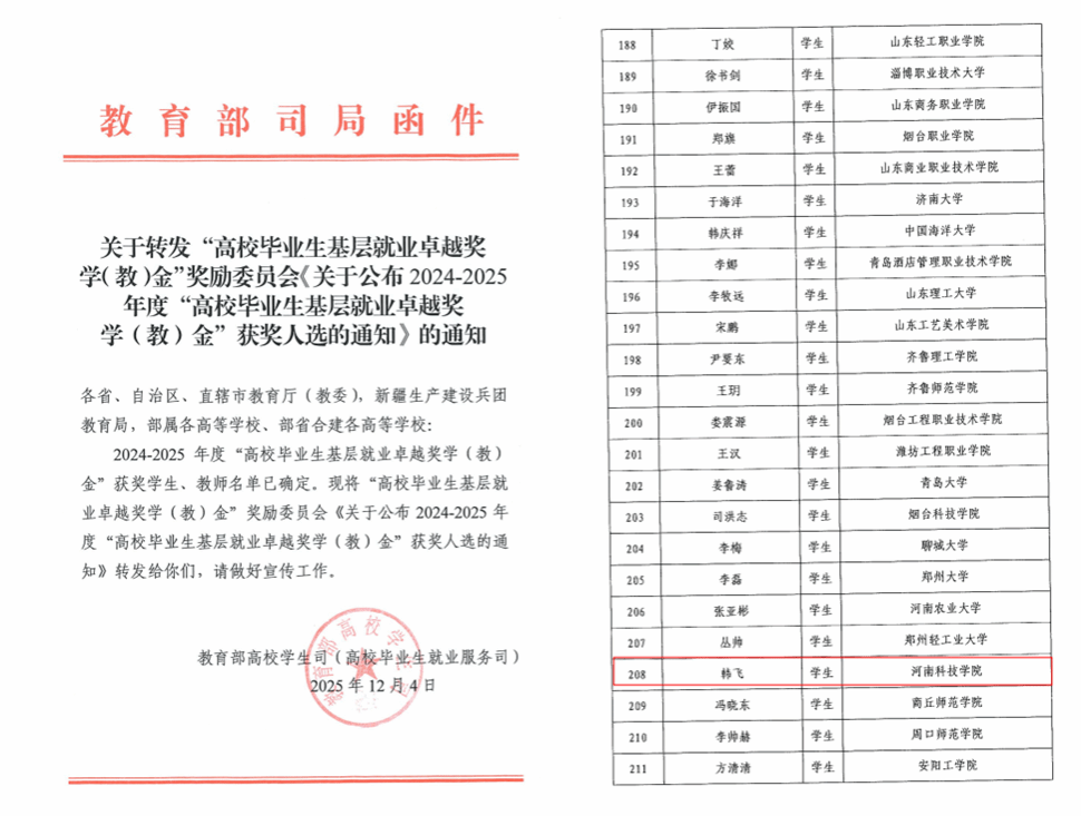 “高校毕业生基层就业卓越奖学(教)金”是由教育部指导设立,旨在表彰赴基层就业并作出突出业绩的高校毕业生,具有极高的权威性与影响力。此次韩飞同学获此殊荣,不仅是对其个人长期坚守基层、实干奉献的高度认可,也充分彰显了我院在就业育人、引导学生服务国家战略方面的扎实成效,是对学院人才培养质量的有力印证。