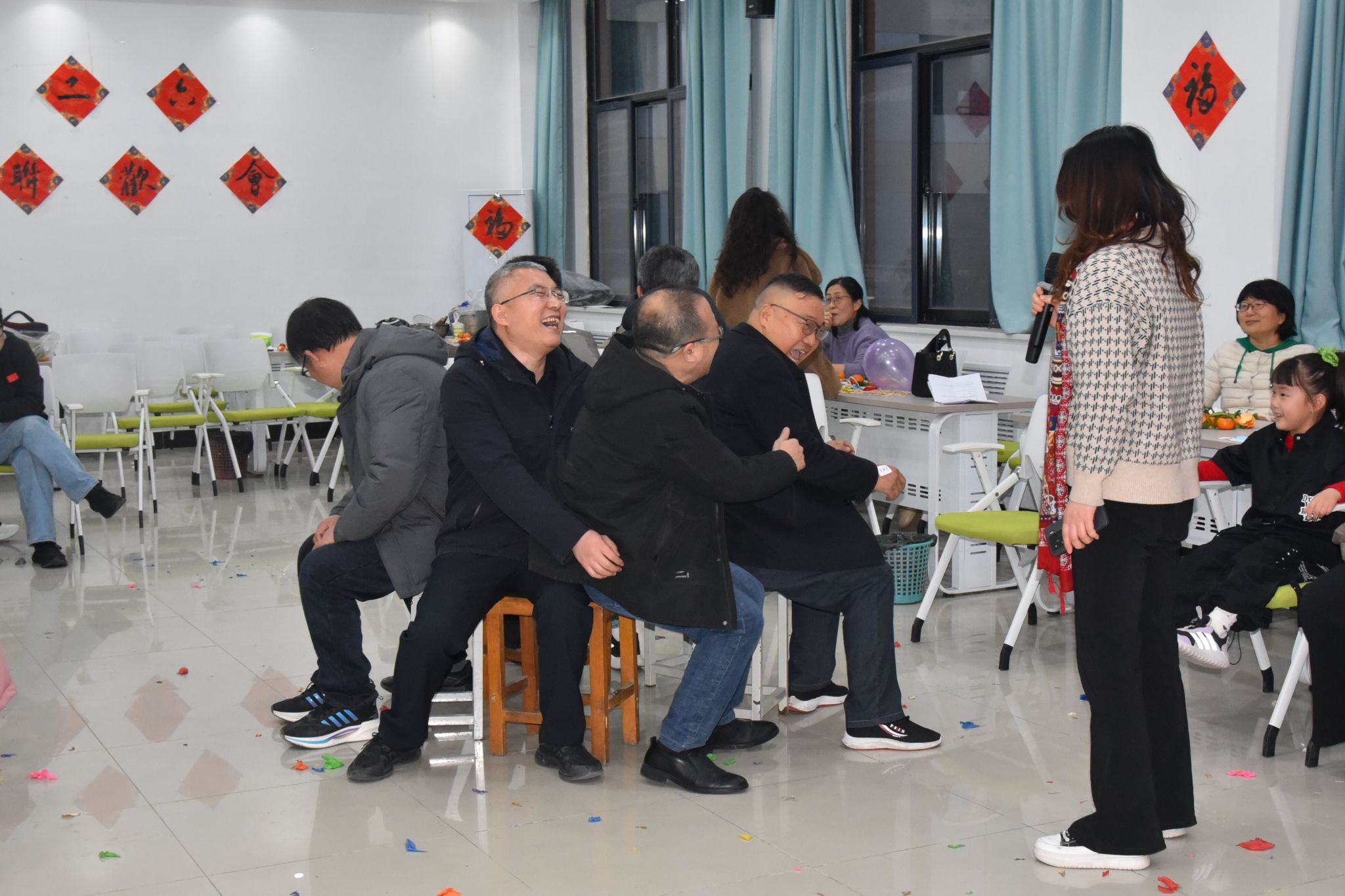 联欢活动在温暖热烈的氛围中拉开帷幕。领导老师用幽默而富有深意的三句半表演总结成绩,描绘新篇,引起欢笑和共鸣。老师们依次献唱,带来歌曲串烧,将气氛推向高潮;24级学生董优的武术表演刚柔并济,展现了青年学子的蓬勃朝气;各工会小组精心准备的各种节目也相继登场,充分展现了教师们多才多艺的风采。活动还穿插了丰富有趣的互动环节:“蒙眼走猫步”考验平衡与方向感,“香蕉运动”比拼双人默契,“影视台词竞猜”唤起集体记忆,而各工会小组参与的即兴“模仿秀”更是引得欢声阵阵。