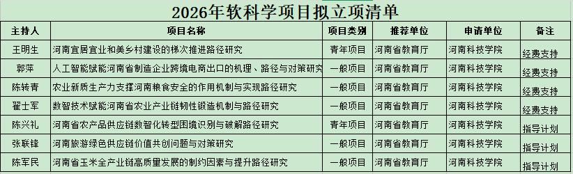 近日,河南省科学技术厅发布2026年度软科学研究拟立项项目公示名单,我院共获批7个项目。其中,翟士军、陈转青、王明生、郭萍四位博士的项目获得经费资助,陈军民、陈兴礼和张联锋三位博士获得指导性立项。此次获批项目数量为近五年来我院获得河南省科技厅软科学项目立项之最,是我院教师在哲学社会科学领域潜心研究和不懈努力的具体体现。