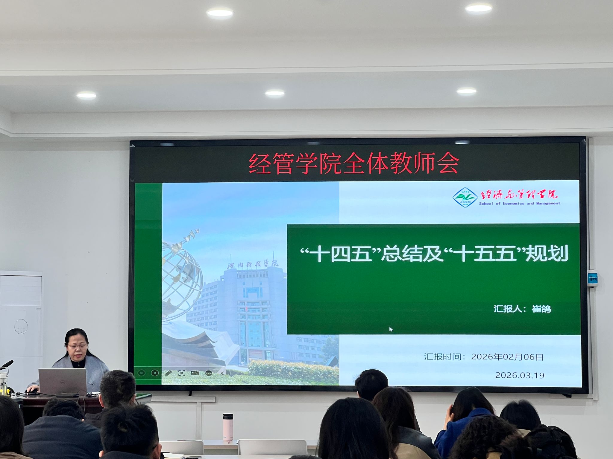 3月19日下午,经济与管理学院在10号楼206会议室召开“十四五”时期工作总结暨“十五五”事业发展规划汇报会。学院执行院长崔鸽作专题汇报,全体教师参加会议。
